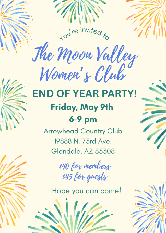 You won’t want to miss our Fabulous End of Year Party at Arrowhead Country Club!  PLEASE JOIN US FOR DINNER, DANCING & END OF YEAR SHENANIGANS! Friday, May 9th 6…